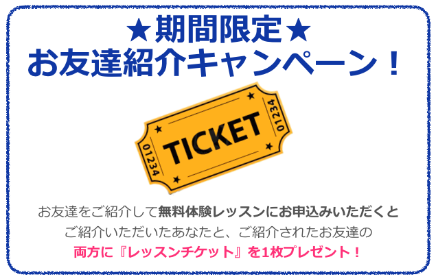 キャンペーン期間中に、まだGLOBAL CROWNを体験したことのないお友達へ紹介をしていただいた場合、紹介した生徒さま、紹介された生徒さま両方へ「レッスンチケット」1回分をプレゼントいたします!