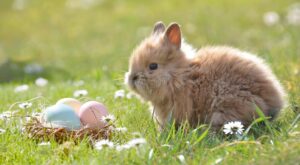芝の上のかごの中にあるパステルカラーのイースターええぐを茶色いウサギが見ている。