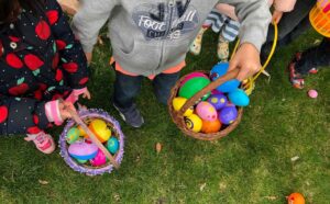 ハントしたエッグがいっぱいに詰まったかごを持つ子供たちの手元