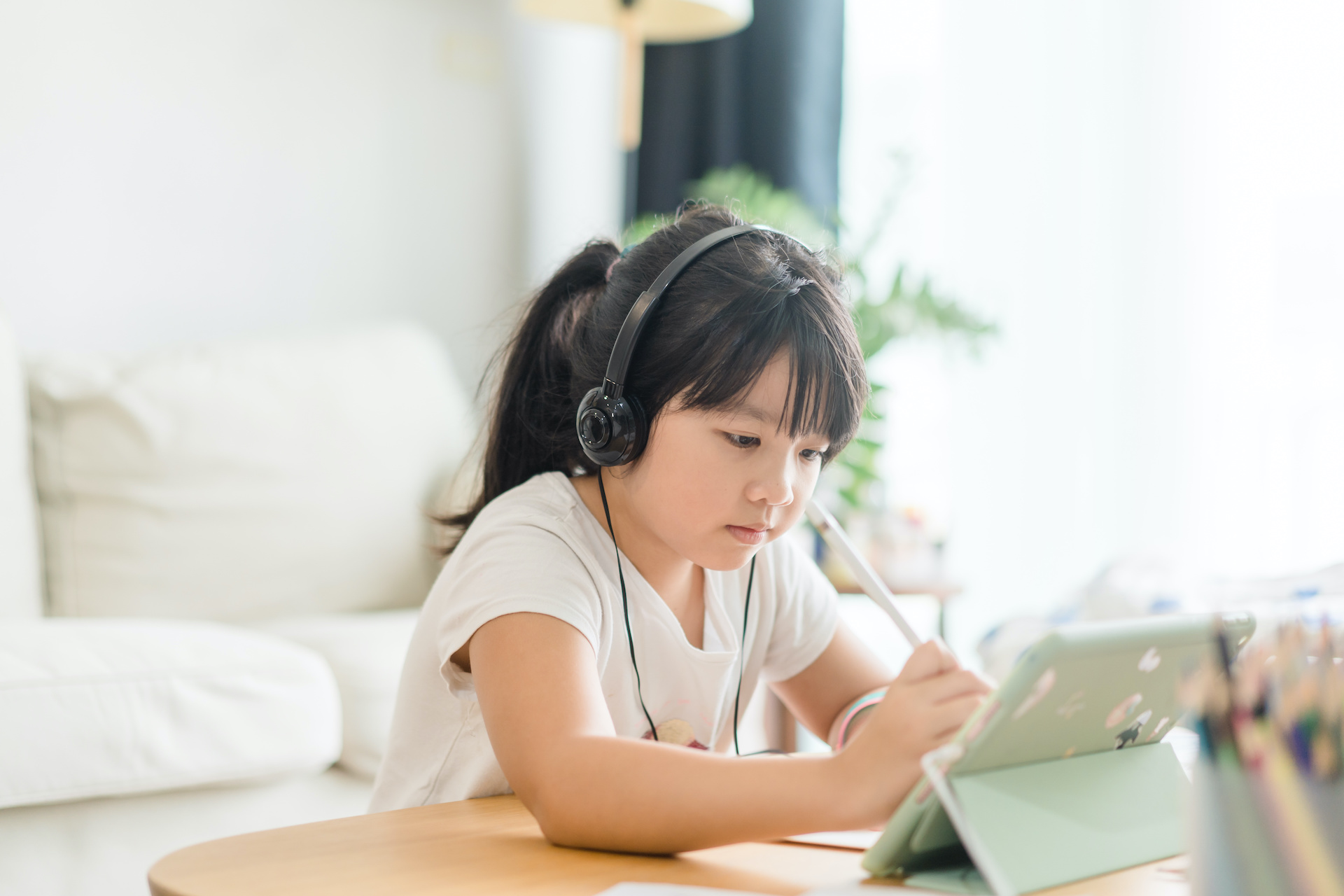 Asian girl student online learning at home.study online video call zoom teacher, kid girl learn english language online with tablet.