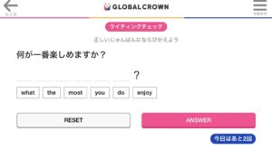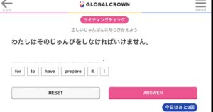 いかがでしたか?英語力は一日で上がるものではなく、日々の積み重ねが大切です。レッスンにきちんと取り組み、復習もしっかり行えば、着実に英語力は伸びていきます。GLOBAL CROWNのカリキュラムはレベルが細かく分かれているので、自分は今どのくらいの位置にいるんだろうということが可視化出来て、モチベーションアップにも繋がります!レベル32を目指して、一緒に頑張っていきましょう♪