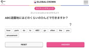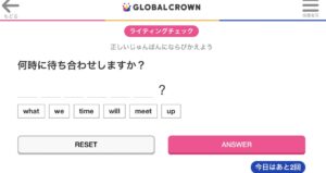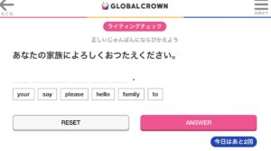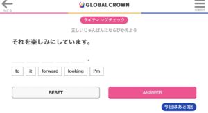 公式アプリの復習機能のライティングでは、ワードを正しい順番に並び替える練習をして英文法の構造を学んでいきます。英語の読み書きがあまり得意ではないお子さまも並び替えにしてあげることによって初めてのライティングにも比較的取り組みやすくなっています。