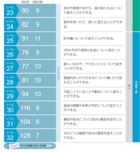 ・レベル32まで終えると、英検準2級レベル(中学校3年生レベル)達成