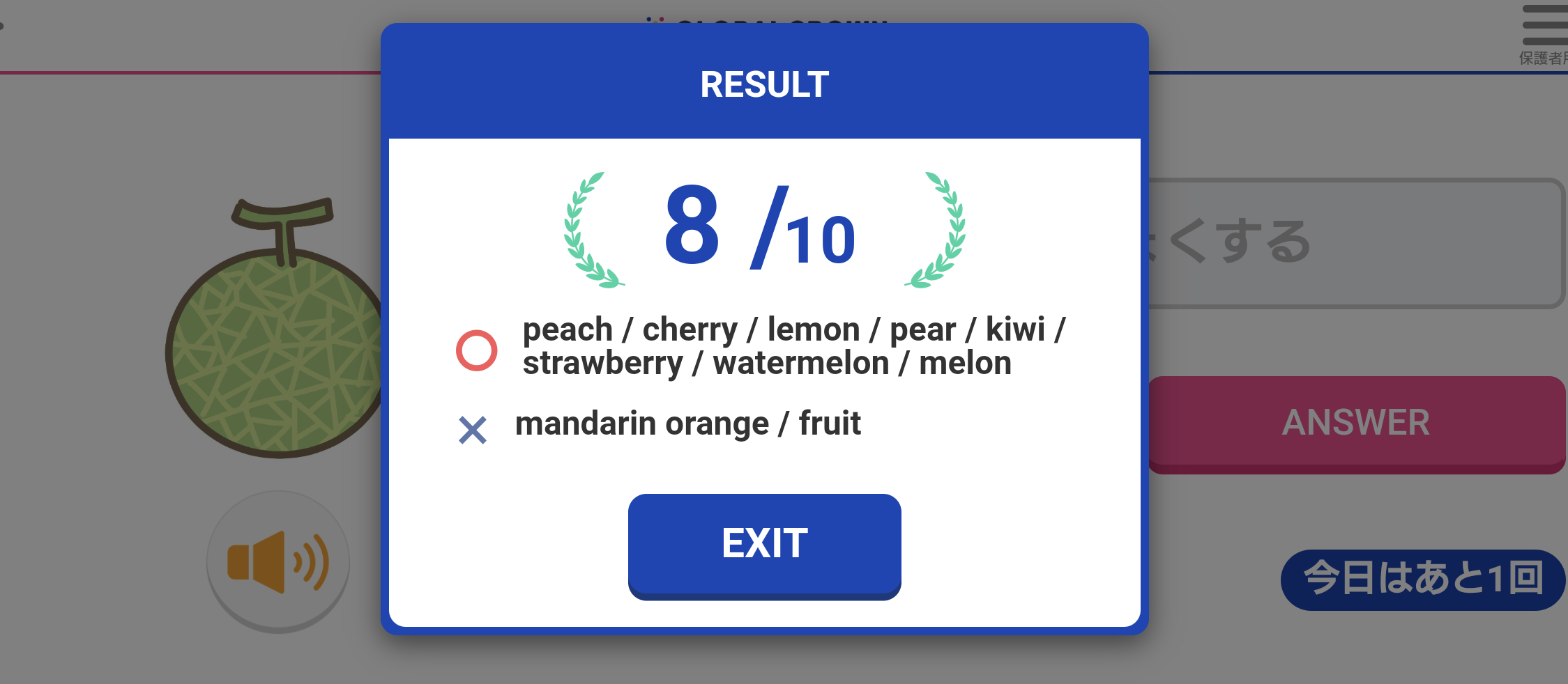 問題の最後には結果が表示され、何個の単語に正解できたかが確認できます。
