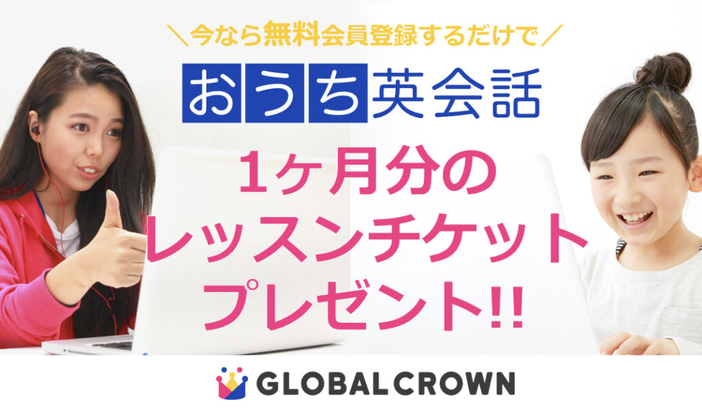 ■注意事項 ※キャンペーン期間中に無料体験へお申込みいただくと、通常2回の無料体験レッスンに加えて、 4回分のレッスンチケットをプレゼントいたします! ※4回分のレッスンチケットは週1回コース(9,800円/月)に相当します。 ※レッスンチケットの有効期限はお受け取りから14日間となります。 ※レッスンチケットは2回の無料体験レッスンをご予約いただいた翌営業日にプレゼントいたします。 ※使用せずに期限がきれてしまったレッスンチケットの補填・払い戻しはできません。 子どものためのオンライン英会話GLOBAL CROWN公式HP