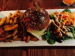 私の食べ物のお気に入りはハンバーガー、ピザ、アイスクリームなどのジャンクフードでした。日本のものよりも塩分や糖分が多く、少し不健康かもしれませんがとても美味しかったです。アメリカのハンバーガーはどのお店でも美味しいので毎回違うハンバーガー屋さんに行って食べていました。